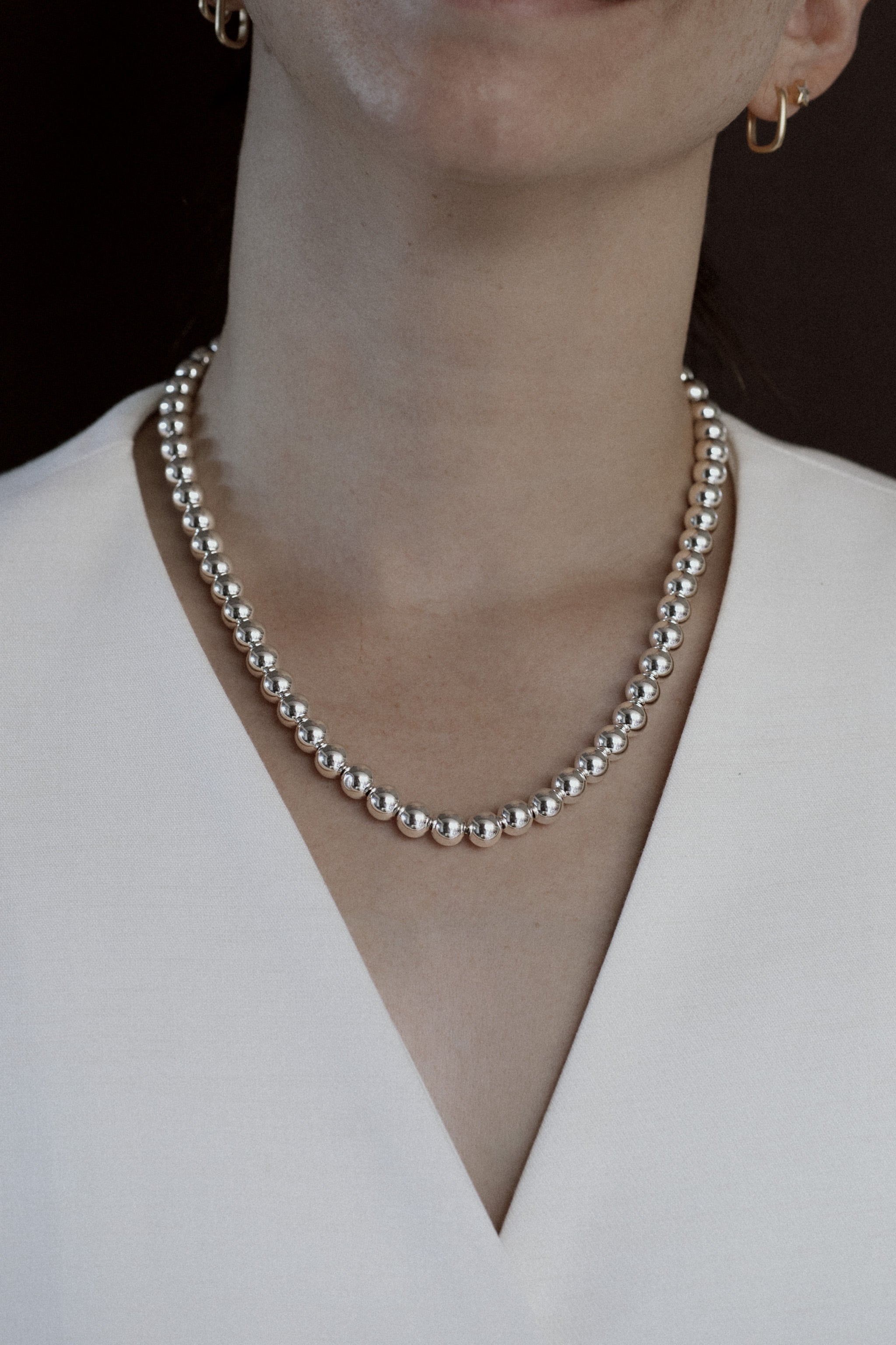 A slimmer version of the Modern Matriarch Bold Set, sterling silver beads are strung on silver chain to create a sculpted, spherical strand. Sterling silver magnetic clasps blend seamlessly and connect with ease - allowing the piece to be worn in multiple ways, on its own or with other Modern Matriarch sets to mix color, texture, and length.