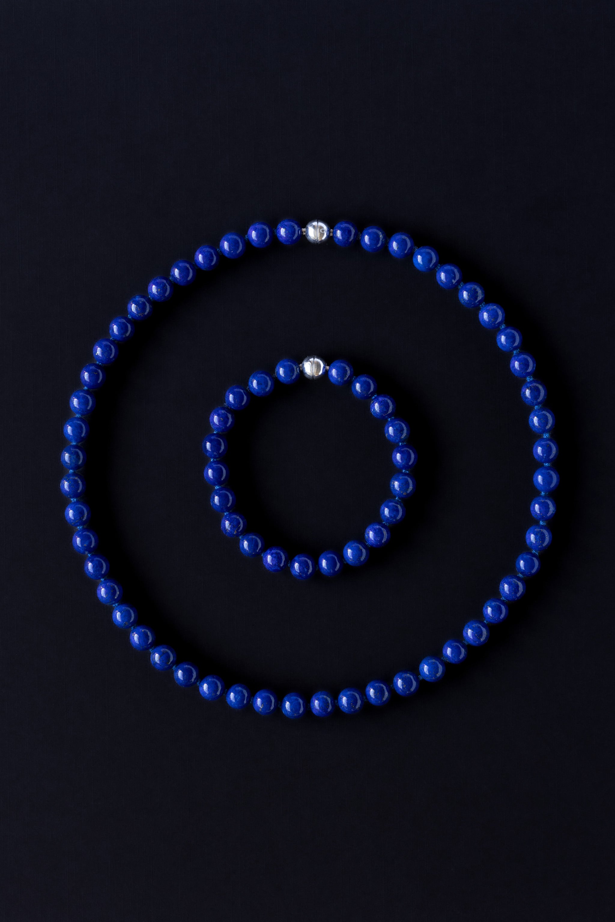 Lapis is natural and undyed. Magnetic clasps are made from sterling silver. Cord is made from silk.