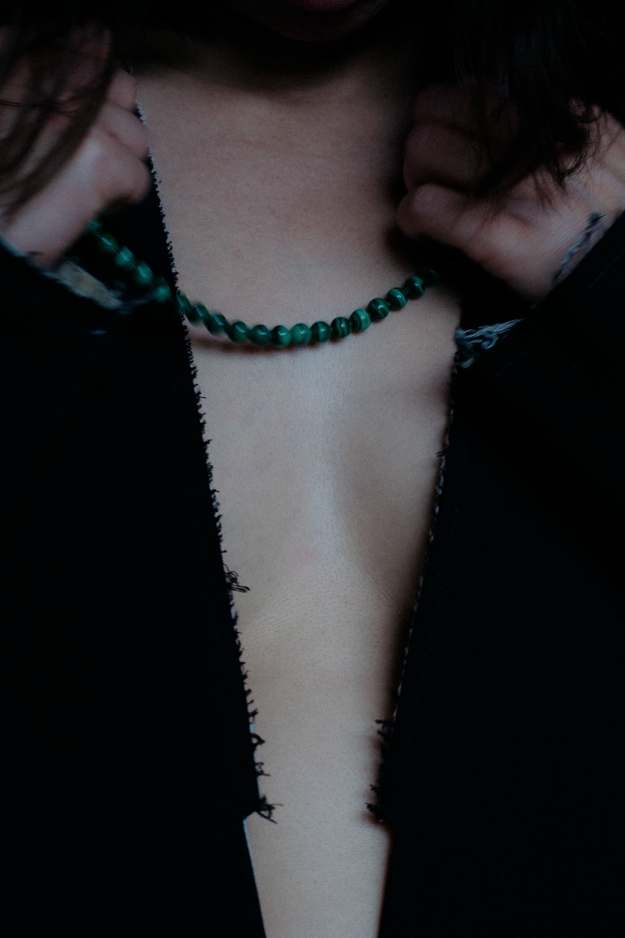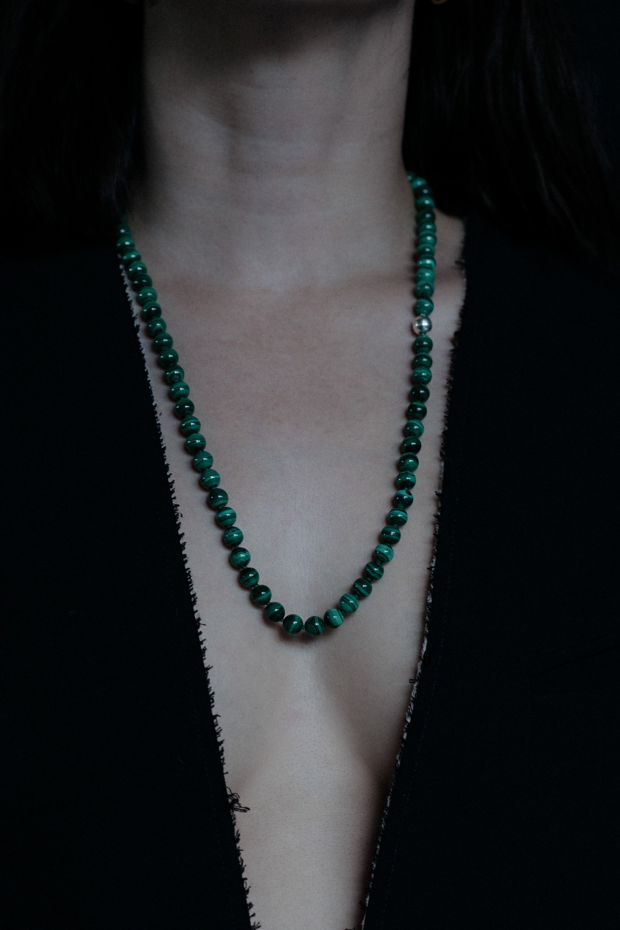 A slimmer version of the Modern Matriarch Bold Malachite Set - green malachite beads, with their distinct banded patterns, are strung on silk cord to create a rich, textural strand. Sterling silver magnetic clasps blend seamlessly and connect with ease - allowing the piece to be worn in multiple ways, on its own or with other Modern Matriarch sets to mix color, texture, and length.